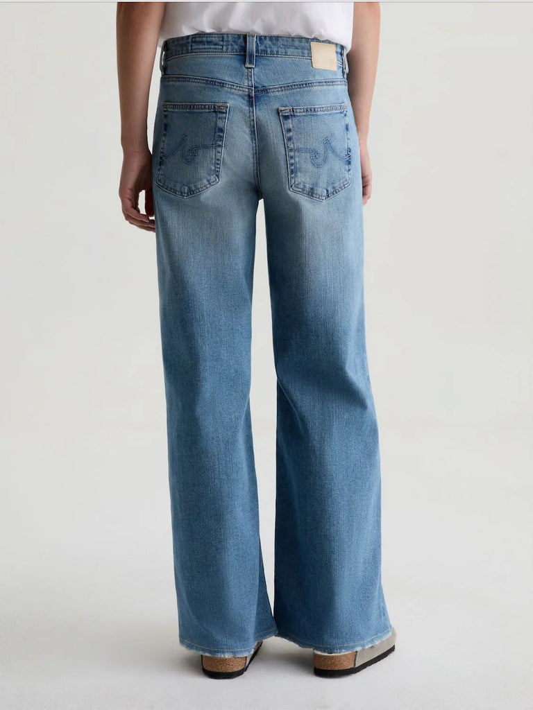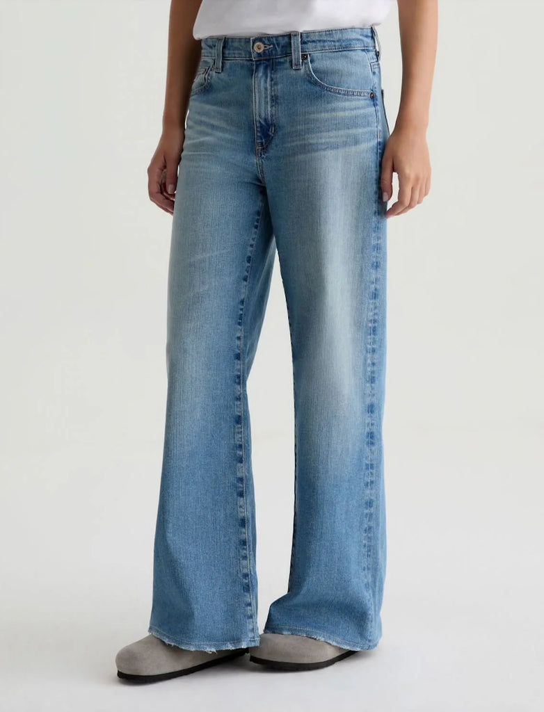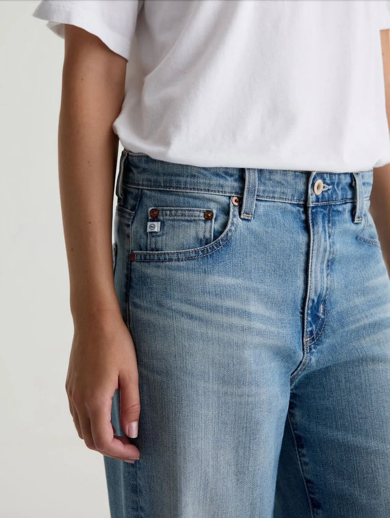 Saige Wide Leg is crafted in Lead Comfort Stretch Denim, a substantial yet stretchy denim from the renowned Kaihara Mill in Japan. This mid-rise jean is adored for its easy, relaxed silhouette. Designed with highs and lows, whiskering, fading, and distressed trim in our medium-light blue wash, Western Front.