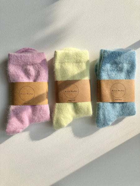 Those cozy wool socks are using the high percentage angora blended thread, make a steady piece with natural wool hand feel, great for the cold weather.