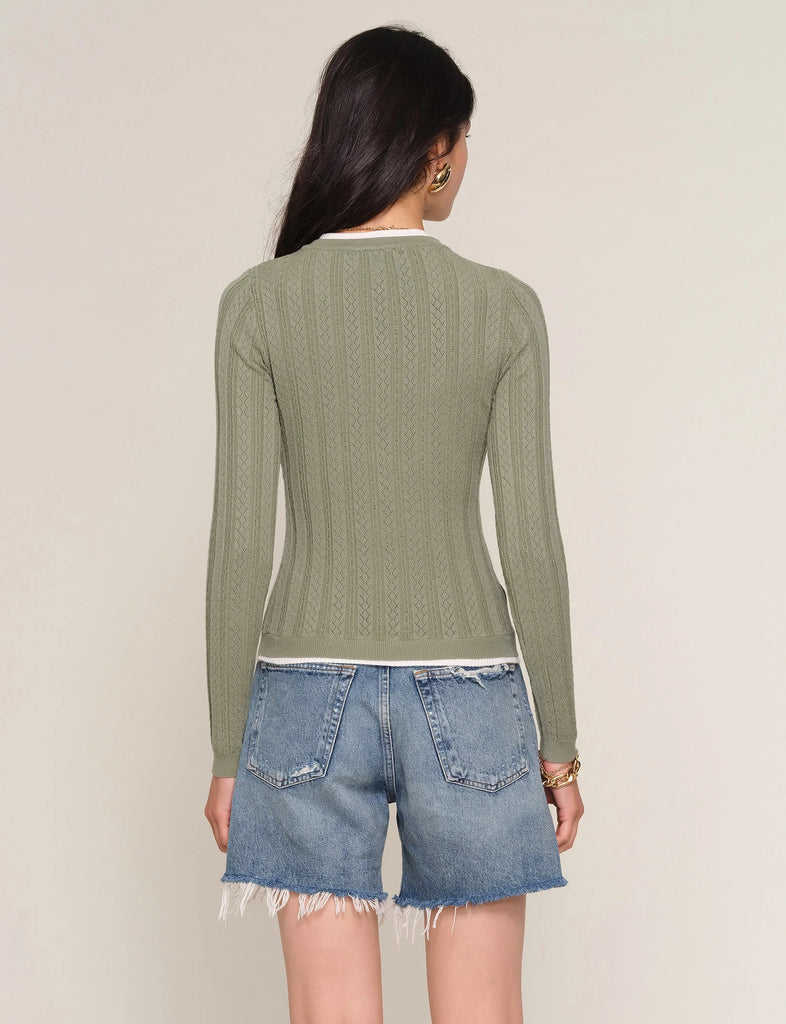 The Tommy Cardi is a light weight, slim fit sweater. It features a delicate, cable stitch throughout the body, and a contrast edge at neck and hem.