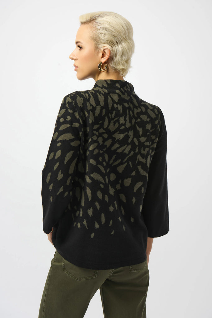 Make a bold impression with this jacquard sweater, featuring a striking animal print and a cozy-chic mock neck design. Framed by three-quarter sleeves and adorned with sparkling rhinestone accents, it brings a perfect balance of comfort and sophistication to any outfit. Whether dressed up or down, this piece adds a touch of effortless glamour.