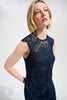 Step into elegance with this stunning knee-length sheath dress by Joseph Ribkoff. Adorned with jewel embellishments and ruffled details, this dress features a sophisticated round-neck and a timeless floral pattern. Perfect for formal and semi-formal occasions, the sleeveless design with straight sleeves exudes a feminine charm. Enhance your wardrobe with this exquisite piece that effortlessly combines style and grace.
