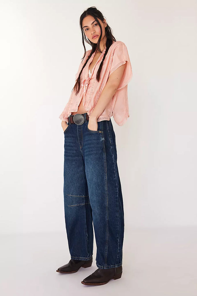So bold barrel jeans from our We The Free collection featured in a mid-rise fit with subtle distressed detailing and wide-legs that taper at the ankle.
