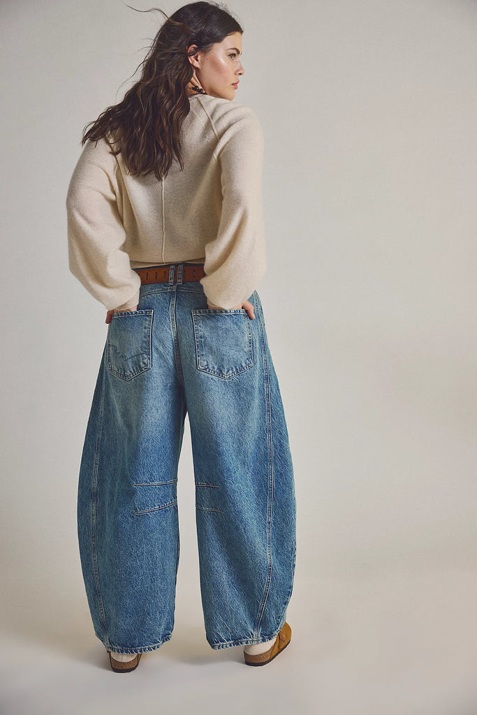 So bold barrel jeans featured in a mid-rise fit with subtle distressed detailing and wide-legs that taper at the ankle.