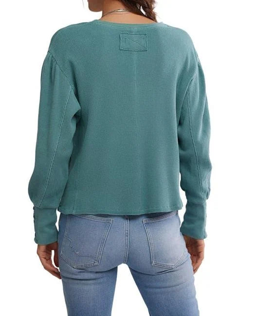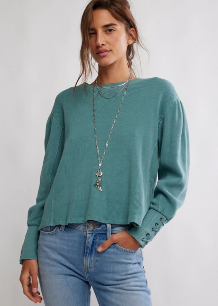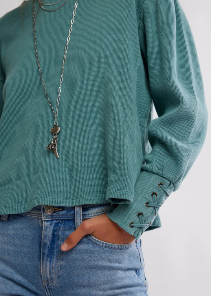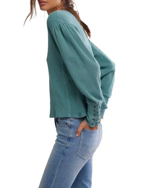 Lace-up details adorn the cuffs of this laidback long sleeve from We The Free, featured in a classic thermal fabrication with voluminous sleeves for added dimension.