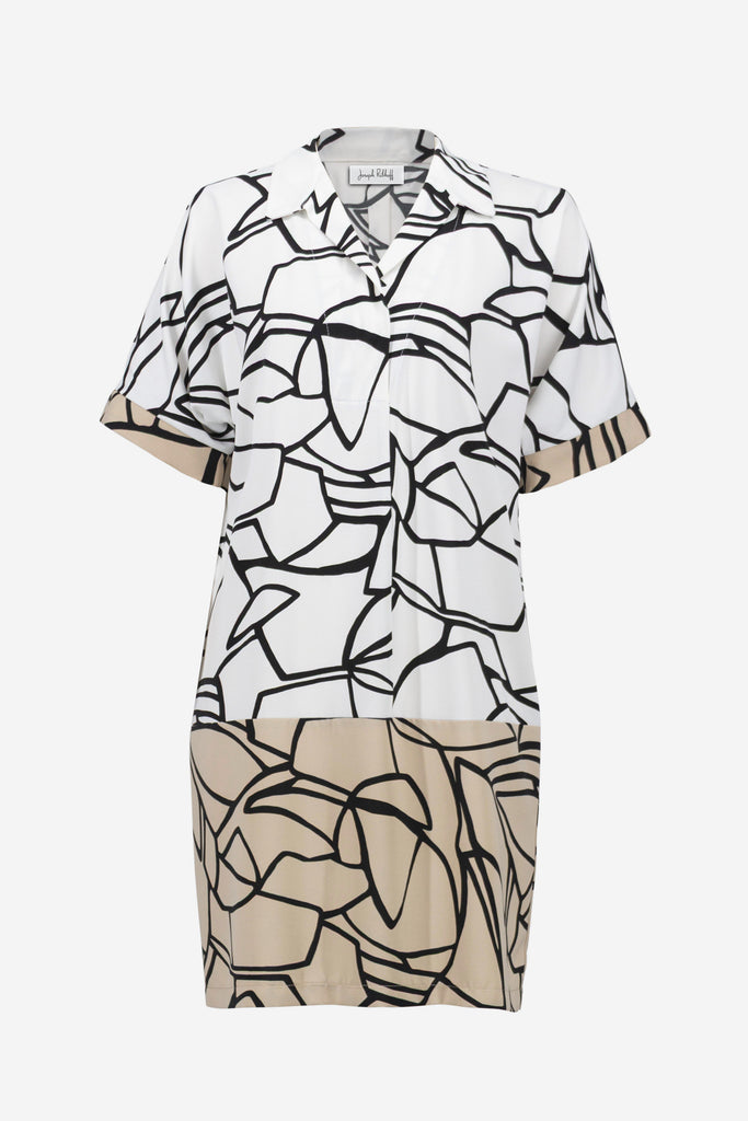 Striking and easy to wear, this recycled woven fabric dress features a fluid abstract print, elbow-length dolman sleeves, and an overlapped V-necklineline with a crisp shirt collar. A bold contrasting hemline band adds a graphic finish.