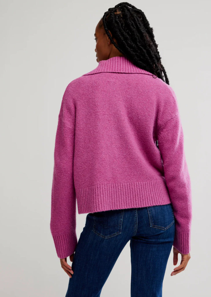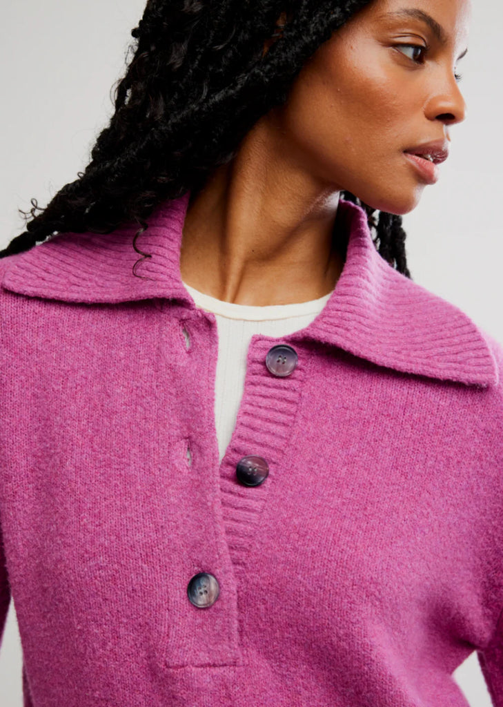 The definition of cozy, this sweater features a classic polo-inspired silhouette, a cotton-blend knit fabrication, and charming tortoise shell buttons.