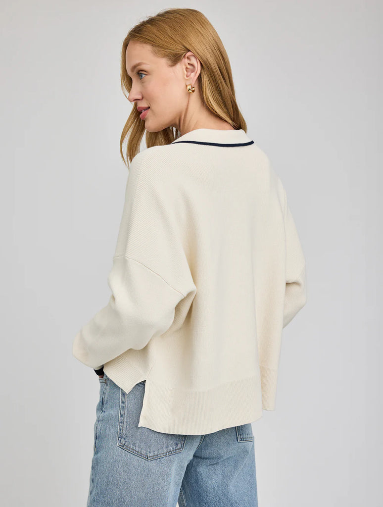 The Tristan sweater is made of a soft yarn in a half cardigan stitch. Features include a collar with v-neckline and contrast stripe color details.