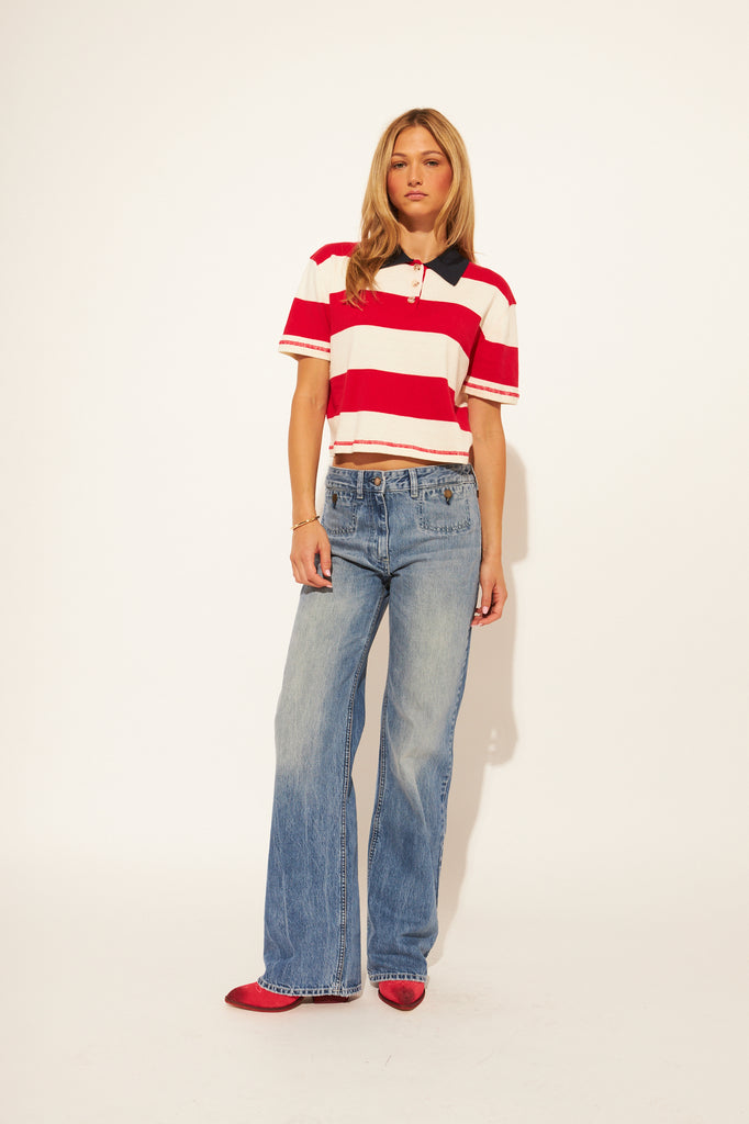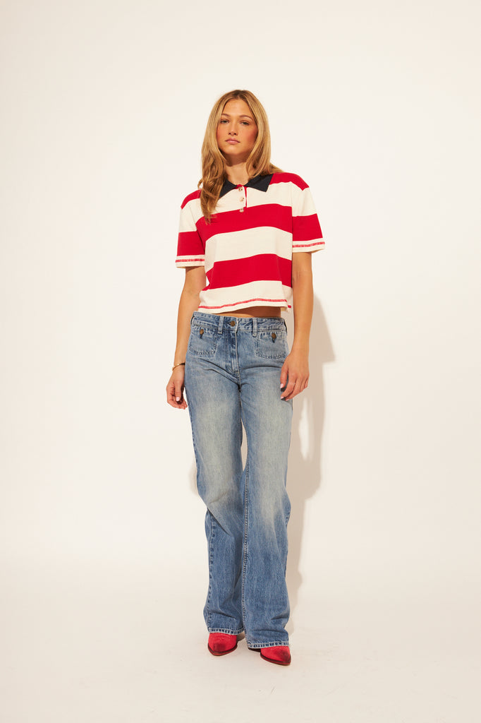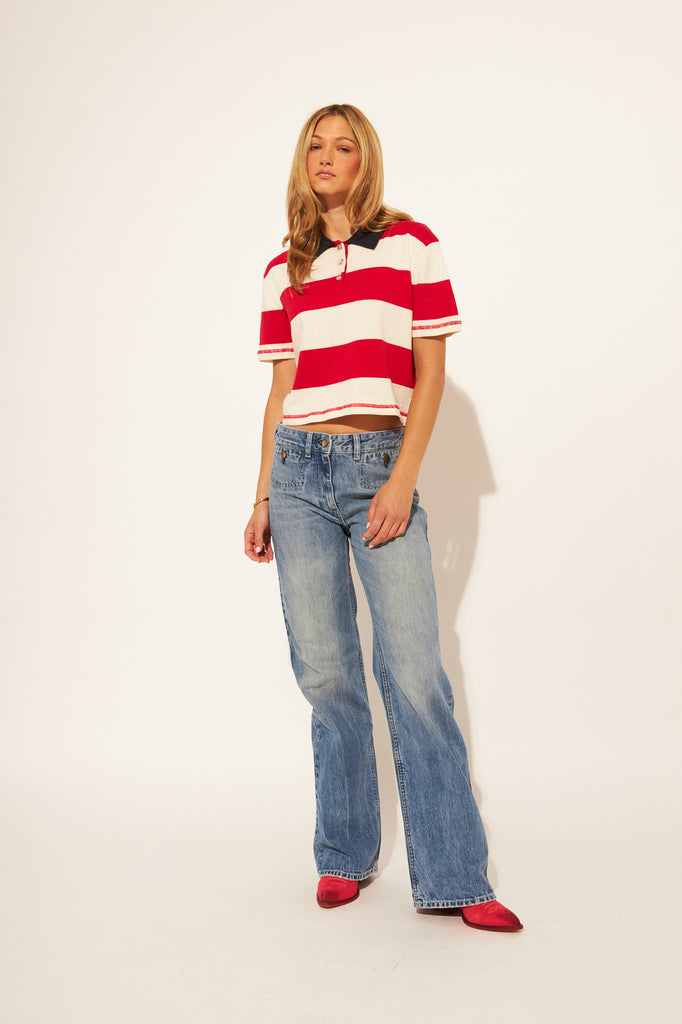 The Angelo Rugby top in Preppy Crimson is a preppy, bold and eye catching. It features a collared shirt, button detailing and stripes.