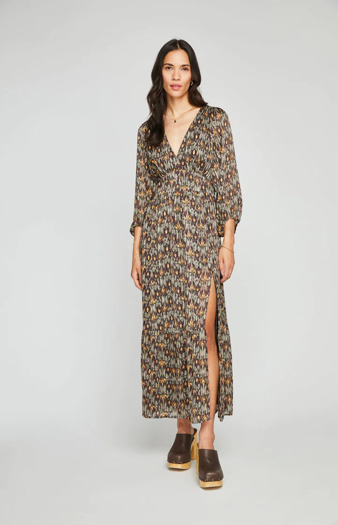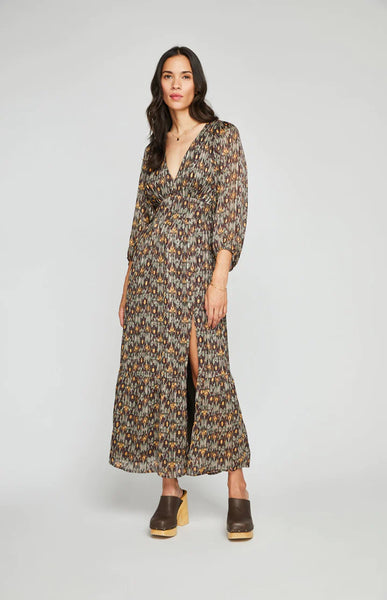 The Beatrice dress is made of a lurex stripe chiffon with a print designed in-house. Features include a back cut-out detail, waist tie and a front side slit.