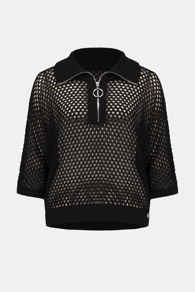 Experience effortless style with the Joseph Ribkoff hip-length jacket, designed for both casual and sporty occasions. Featuring a relaxed fit and a sophisticated v-neckline, this piece boasts a zipper closure, ring detail, and mesh accents. The plain pattern and 3/4 straight sleeves add versatility, making it a must-have for your wardrobe. Embrace comfort and elegance effortlessly.