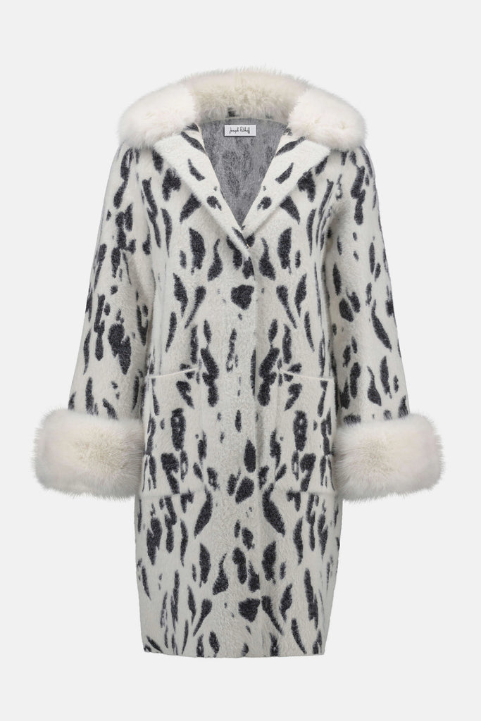 Embrace your wild side with this bold coat, showcasing a striking animal print and luxe faux fur trim at the collar and cuffs. Crafted from feather yarn sweater knit, it boasts an irresistibly soft texture, while the notched collar and straight silhouette exude timeless sophistication. Destined to be a standout in your cold-weather wardrobe, this coat is the perfect blend of daring style and cozy elegance.